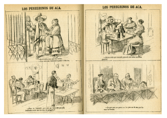 La caricatura “Los peregrinos de acá” registró algunas situaciones que se presentaron durante la coronación. En la primera viñeta una pareja de campesinos no puede entrar a la Colegiata por no traer boleto. La escena siguiente describe a comensales quejándose de la comida en mal estado. En la última ilustración un burgués acompañado de dos mujeres observa un espectáculo y expresa que lo que más les gusta son las piernas de la Peralta. La imagen en primera instancia criticó que en la ceremonia de la coronación sólo se permitió la entrada a personas distinguidas y sacerdotes, mientras la clase pobre tuvo que contentarse con pasear en los alrededores [ El Mundo Ilustrado 1895: 126 ]. La representación de alimentos y bebidas adulteradas evidenció el comportamiento abusivo de fondistas, hosteleros, vendedores y rateros. La figura del burgués, por último, retrató la hipocresía de los romeros a quienes sólo les interesaba pasear y divertirse.