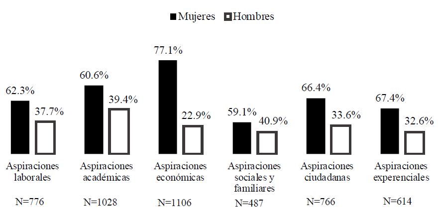 Debido a las características de los reactivos de la encuesta —los estudiantes tenían la posibilidad de elegir más de una respuesta por pregunta— y a la disparidad entre la proporción de hombres y mujeres que respondieron a ella, se optó por analizar los datos desde la perspectiva cuantitativa y tomando en cuenta, principalmente y de forma independiente, las variables de sexo y tipo de aspiración. Los resultados de esto se sintetizan en el siguiente apartado.