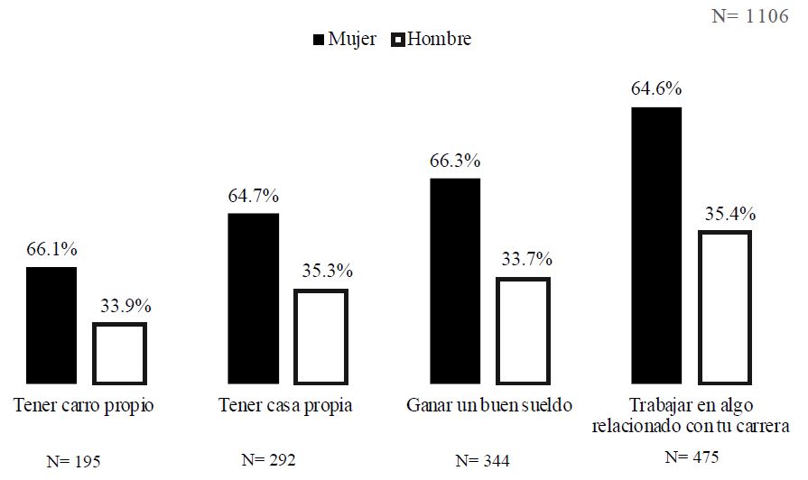 Al hacer una distinción de las aspiraciones económicas elegidas y el sexo de las y los participantes, podemos observar que existe coincidencia en cuanto a que, para los hombres y las mujeres que participaron en este ejercicio, trabajar en algo relacionado con su carrera, ganar un buen sueldo y tener casa propia es igualmente significativo; debido a que, si separamos las respuestas según el sexo, el orden de prioridad entre estas es similar.