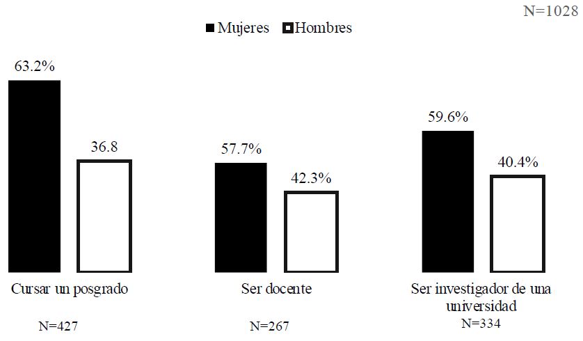 Para los hombres, por otro lado, resulta primordial la aspiración de ser docente. A ello le sigue el anhelo de ser investigador de una universidad y, finalmente, el cursar un posgrado.