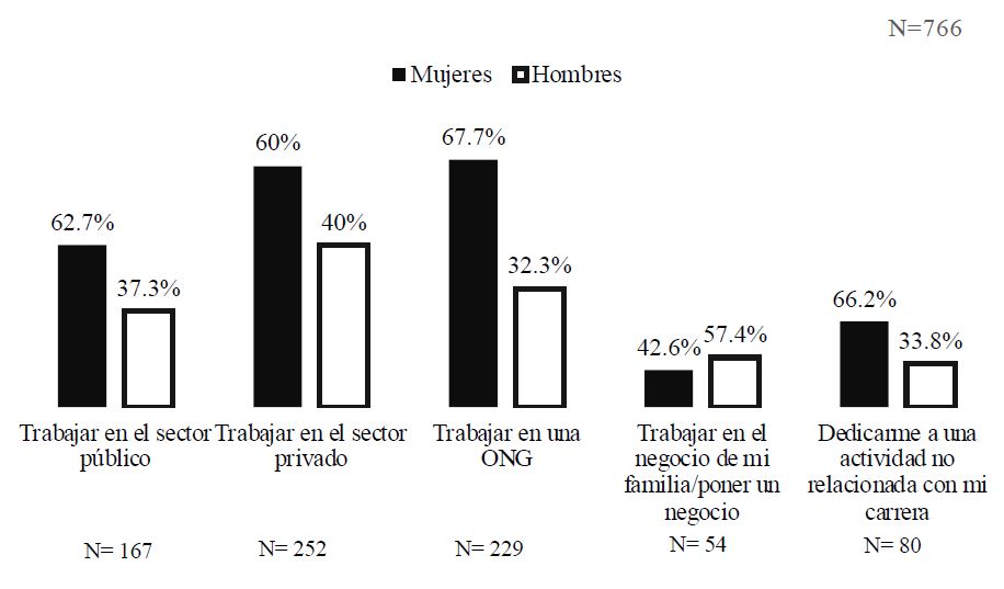 Entre el conjunto de las aspiraciones laborales, podemos observar que para el caso de las mujeres el trabajar en una ONG o trabajar en el sector privado es casi igual de importante. En esta categoría, además, destaca que trabajar en el negocio de la familia, o bien poner un negocio, es una aspiración más importante para los hombres que para las mujeres. En contraste, en la aspiración de dedicarse a una actividad no relacionada con la carrera, resalta el mayor interés de las mujeres que de los hombres.