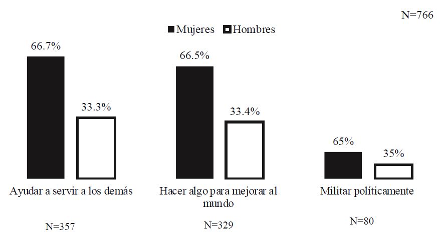En la gráfica 6, por ejemplo, puede notarse que entre las aspiraciones ciudadanas destaca el interés de los estudiantes por ayudar a servir a los demás y hacer algo para mejorar el mundo. El militar políticamente, empero, es una de las aspiraciones que, incluso en términos generales, resulta poco atractiva para el estudiantado.