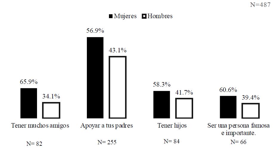 Finalmente, entre las aspiraciones sociales y familiares, podemos observar la relevancia que tiene para el estudiantado el apoyar a los padres. Las respuestas en torno al interés de tener muchos amigos y tener hijos es, finalmente, muy parecida en ambos casos, pues es una de las respuestas menos elegidas tanto entre las mujeres como entre los hombres. Esto lo podemos observar en la gráfica 8 que se presenta a continuación.