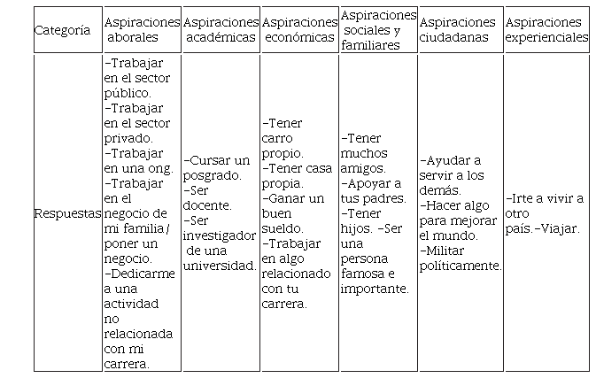 Para el análisis de los datos que reflejan las aspiraciones de futuro de los estudiantes, se agruparon en seis categorías las 21 opciones de respuesta de las preguntas “Q64. Al concluir la carrera te gustaría […]” y “Q65. Cuando seas profesionista esperas […]”. Dichas categorías y tipos de respuestas pueden observarse en el siguiente cuadro: