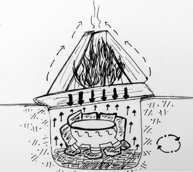 Horno efímero de pozo y pira. Las flechas representan los flujos de calor, aquellas de guion corresponden a la pira, las negras gordas (hacia abajo) representan la presión que genera el calor de la pira sobre el pozo; las negras delgadas rectas (hacia arriba) corresponden al calor del pozo, proveniente de la cama de carbón prendido y finalmente las flechas negras punteadas resultan de la contención generada en el pozo entre los flujos de la pira y los de la cama de carbón, generando una atmósfera neutra.