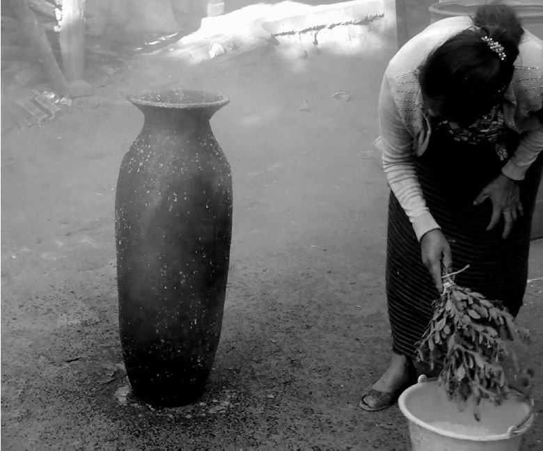 El pliegue del nacimiento no es otro sino “varias cosas al opuesto de”. “En lengua tzeltal este pliegue del nacimiento se conoce como sbot’ sba, expresión que designa un tejido o vestimenta vuelto del revés: el envés de lo visible.” [Pitarch 2013: 24]. Si la cerámica se desarrolla y nace del fuego, un fuego considerado aún sagrado,13 se comprende como un ser animado y el horno, el vientre, su madre, una suerte de envoltorio donde los flujos de frío-calor se pliegan sobre la cerámica hasta el momento de su nacimiento.