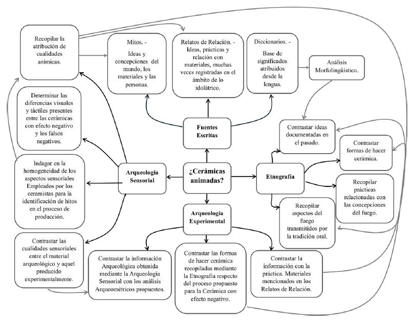 El siguiente cuadro resume los elementos metodológicos empleados para resolver las preguntas hasta aquí planteadas, que conforman parte esencial de la hipótesis: el fuego se considera sagrado aún en el hacer y en el caso de la cerámica decorada con efecto negativo, el tipo de quema y los recubrimientos empleados para su elaboración presentan también cualidades simbólicas específicas que nos indican la animicidad de este tipo de cerámicas.1