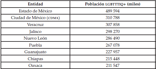 Con el objetivo de tener un panorama del universo de la población LGBTTTIQ+ en nuestro país y en la Ciudad de México, cabe destacar que el INEGI llevó a cabo una encuesta sobre la diversidad sexual y de género [2021] en la que se muestra la cantidad de personas pertenecientes a la población no binaria. Esa encuesta refriere que 5 000 000 (5.1 de la población total del país) pertenece o se identifica como persona no binaria, de los cuales 2.1 son hombres y 2.9 mujeres. El INEGI [2021] señala que son fundamentalmente nueve entidades del país donde se encuentra la mayor concentración de la comunidad sexodiversa, como se muestra en el cuadro a continuación: