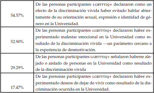 Aunado a lo anterior y para confirmar que la comunidad universitaria LGBTTTIQ+ no siente el campus universitario como incluyente, plural y de respeto, 52.90% de las personas señaló que experimentaron “malestar emocional en la universidad”, producto de la discriminación que han padecido, además, el estudio refiere ese hecho como “un parámetro cercano a la experiencia de desmotivación”, cuando debería ser justamente lo contrario.