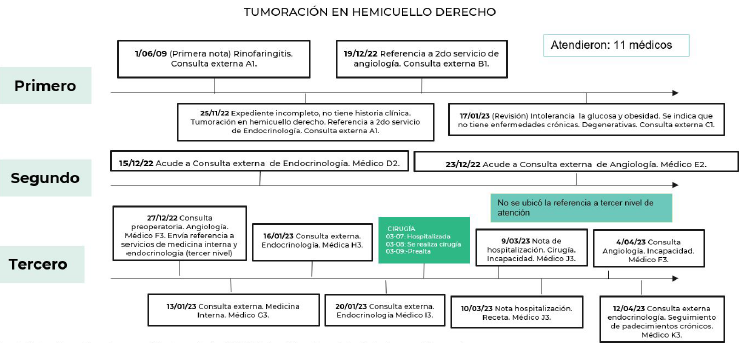 Los datos de este nivel fueron muy escasos; el caso de Romina era uno de los expedientes físicos que no tenía información. No obstante, reconstruimos esta trayectoria con las notas de referencia y contrarreferencia del primer y tercer nivel de atención. En las notas observamos que fue atendida por los servicios de Endocrinología y Angiología y referida para ser intervenida quirúrgicamente en tercer nivel. Resalta que la atención en este nivel se realizó de manera expedita; en 15 días había sido referida al tercer nivel de atención. Dado que sólo acudió a una consulta en cada servicio siempre la atendieron los mismos médicos.