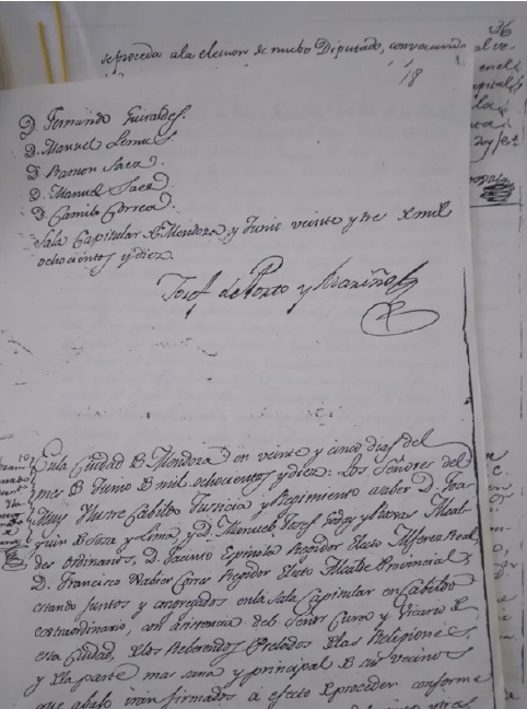 En documentos del Archivo Histórico de Mendoza de junio de 1810 aparecen Ramón y Manuel Sáez como vecinos mendocinos, vinculados con los pareceres sobre lo que sucedía en relación con los intentos independentistas, iniciados en mayo de ese año en el cabildo de Buenos Aires. Ellos eran familiares ascendentes de Manuel Antonio Sáez. “Puntualmente consta que Manuel Sáez (suponemos con bastante certeza que era abuelo de Manuel Antonio) y Ramón Sáez (tío bisabuelo de Manuel Antonio, hombre de fortuna, y Alférez Real en 1809) firmaron en Mendoza el acta de Cabildo extraordinario del 23-vi-1810, en que se acataba a la Junta de Buenos Aires” (p. 17). En esta foja, fotocopiada en el Archivo Histórico de la Provincia de Mendoza por la autora de esta reseña —Martha Delfín— aparecen dichos nombres: