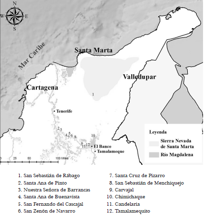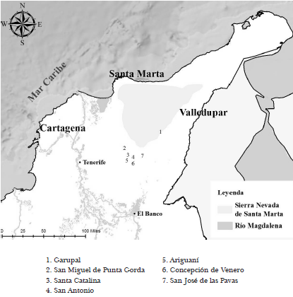 El territorio que he venido mencionando se sitúa más allá de las fronteras de los españoles al norte del Virreinato de Nueva Granada, más específicamente se trata de la selva interfluvial que se extiende entre los ríos Cesar al este y Magdalena al oeste; la Depresión Momposina al sur y al norte hasta la Ciénaga Grande y Sierra Nevada de Santa Marta (Reichel- Dolmatoff, 1946). Fue un territorio selvático habitado por pueblos precolombinos sometidos a procesos de poblamientos, intercambios culturales materiales e inmateriales y al intento por parte de la Corona de establecer fronteras fijas y un dominio perceptible y eficaz. Esta área, es la que denomina Viviana García como área de frontera, que se refiere al territorio adyacente a los límites donde todas las relaciones de sociabilidad se gestan (García, 2015). Estas fronteras antes que dominar, se convirtieron en lugares difusos, poco claros, con retrocesos y avances continuos; más bien en lugares de negociación y sociabilidad de todos los grupos que cohabitaban a lo largo de todo el territorio.