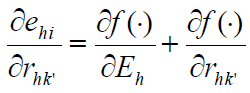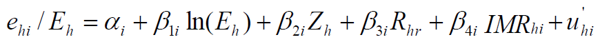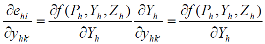 [4]donde, como en la mayoría de los estudios sobre la demanda, los gastos totales Eh se usan en lugar de los ingresos. El efecto marginal del cambio en los ingresos derivados de las remesas, rhk' , en los gastos del hogar h en bienes i es por lo tanto: