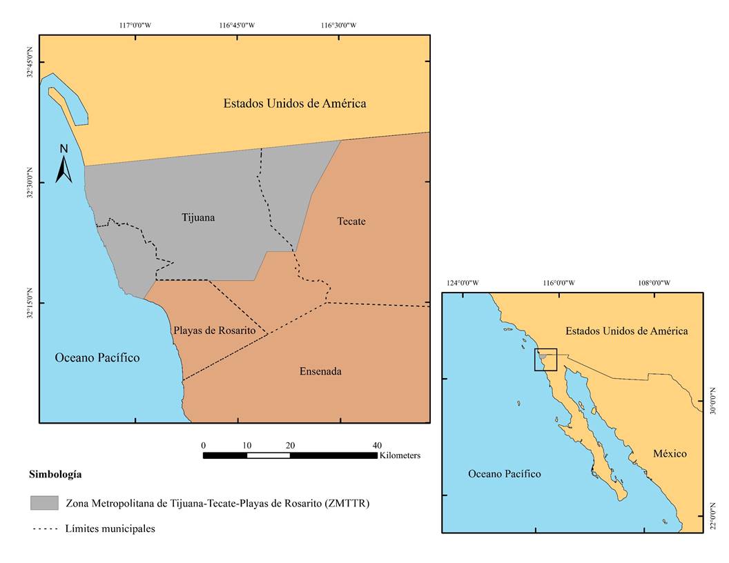 Reconocida en el 2004 como unidad geográfica, económica y social, para planear y regular conjuntamente el desarrollo (Gobierno del Estado de Baja California, 2004, p. 16), la ZMTTR se localiza al noroeste de Baja California, en México. Colinda al norte con Estados Unidos (EE. UU.) y al oeste con el océano Pacífico, y comprende 139 864.44 ha (1.68% del estado) (Venegas y Rojas, 2009). Se compone de tres municipios: Tijuana, Tecate y Playas de Rosarito (Rosarito) (Figura 1).