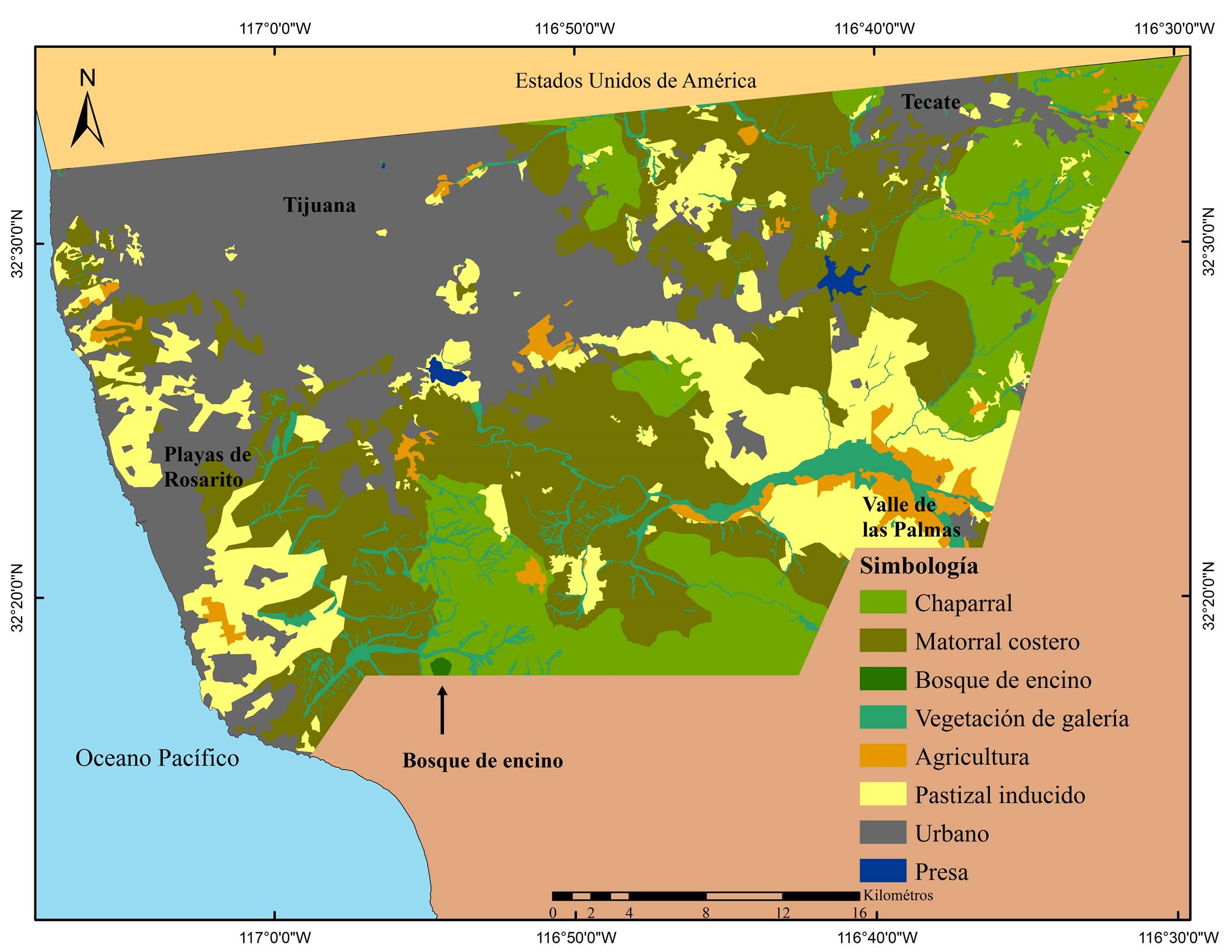 Con el objetivo de conocer el estado actual de la ZMTTR, se construyó un mapa de usos del suelo y tipos de vegetación usando ArcGis 10.2 e imágenes de satélite SPOT (31 de diciembre de 2012 y 21 de enero de 2013), escala 1:50 000 y con 30 m de resolución. La zona de estudio se estableció con base en Venegas y Rojas (2009). Los usos del suelo y tipos de vegetación se interpretaron visualmente y se digitalizaron en pantalla, corroborando con Google Earth, con el mapa del 2005 de la Cuenca del Río Tijuana elaborado por Farley et al. (2012) y con trabajo de campo, verificando la asignación de 20% del total de los polígonos identificados. Se usó la clasificación de usos del suelo y tipos de vegetación de Ojeda-Revah (1999) y adaptada a la región (bosque de encino, chaparral, matorral costero, vegetación riparia, agricultura de temporal y de riego, urbano y presas).
