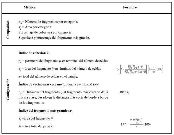 La estructura del paisaje y su conectividad se determinó con índices de composición y configuración (Tabla 1), usando el programa FRAGSTATS 4. Los primeros se refieren a la diversidad y abundancia de los tipos de fragmentos dentro del paisaje, sin considerar su ubicación espacial, mientras que los últimos, sí consideran su localización y cómo se distribuyen ente ellos (McGarigal, 2006).