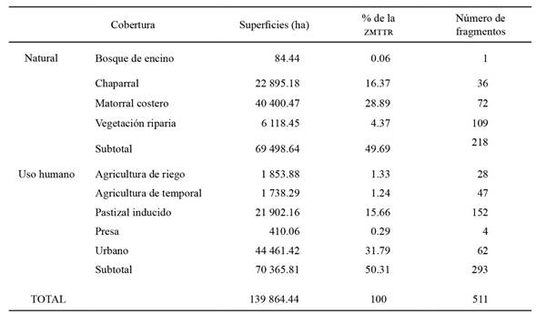 La ZMTTR aún conserva casi la mitad de su superficie con vegetación natural en diferentes grados de conservación a pesar de estar cubierta en una tercera parte por áreas urbanas. Los ecosistemas de mayor extensión son el matorral costero, seguido del chaparral y de la vegetación de riparia y de un pequeño fragmento de bosque de encino al suroeste. Sin embargo, los ecosistemas naturales (principalmente el matorral costero y el chaparral) están fragmentados por las tres ciudades y por la presencia de muchos pequeños fragmentos de pastizal inducido alrededor de las zonas urbanas. Las ciudades de Tijuana y Rosarito están integradas en un solo fragmento, unido a Tecate y al Valle de las Palmas por muchos fragmentos urbanos pequeños conectados por carreteras (Tabla 2, Figura 2).