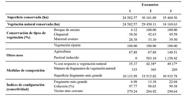 En el tercer escenario, al trazar un cinturón verde alrededor de las áreas urbanas, la superficie a conservar alcanzaría una cuarta parte de la zona de estudio, lo que representa 49.2% de la vegetación original (casi la mitad del chaparral, 40% del matorral costero y todo el bosque de encino y la vegetación riparia), dispersa en 255 fragmentos. Al ampliar la conectividad, el fragmento más grande aumenta poco más de 10 000 ha. El resto de los fragmentos son menores de 500 ha e inclusive casi 95% de estos, son menores de 50 ha (Figura 3c). La superficie de agricultura y pastizales inducidos aumenta a 3.8% del área a conservar incluidas en el análisis de conectividad porque pueden ser conservadas (como se observa en la Tabla 3).