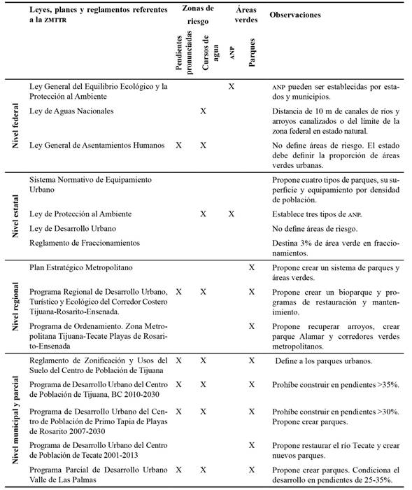 Los resultados del análisis del marco legislativo en el que se inserta esta propuesta se resumen en la Tabla 4. En materia de riesgos la Ley de Aguas Nacionales (SARH, 1992/2014) prohíbe la construcción sobre cauces naturales y especifica áreas de amortiguamiento. Asimismo, aunque las leyes de asentamientos humanos federal y del estado de Baja California (Gobierno del Estado de Baja California, 1994/2013; Sedesol, 1993) mencionan que no se debe construir sobre zonas de riesgo con pendientes pronunciadas, estas no se especifican. A nivel regional y municipal, casi todos los reglamentos y planes y programas de desarrollo urbano prohíben la construcción en lugares con riesgos, en áreas con pendientes pronunciadas (>35%, en Rosarito >30%) y en cauces naturales, pero no detallan medidas. En lo que se refiere a la creación de áreas naturales protegidas (ANP), el estado y los municipios tienen facultad de crearlas, (Secretaría de Medio Ambiente y Recursos Naturales y Pesca [Semarnap], 1988). No obstante, en la zona de estudio, a la fecha no se ha declarado ninguna.