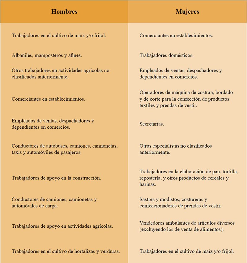Lo que ocurre en Puebla es que las principales ocupaciones femeninas son el trabajo doméstico, las operadoras de máquinas de costura, bordado y de corte para la confección de productos textiles y prendas de vestir, las secretarias, en la elaboración de pan, tortilla, repostería, y otros productos de cereales y harinas, las sastres y modistas, costureras y confeccionadores de prendas de vestir y las vendedoras ambulantes de artículos diversos (excluyendo los de venta de alimentos). En cambio, los hombres se ocupan en actividades relacionadas con la actividad agrícola, así como albañiles, mamposteros y afines, y conductores. Las ocupaciones que se clasificaron entre las 10 principales para ambos sexos son en el comercio y en el cultivo de maíz y/o frijol. A diferencia de Baja California, se trata de ocupaciones ligadas a actividades productivas menos salarizadas y propias de localidades rurales (Tabla 10).