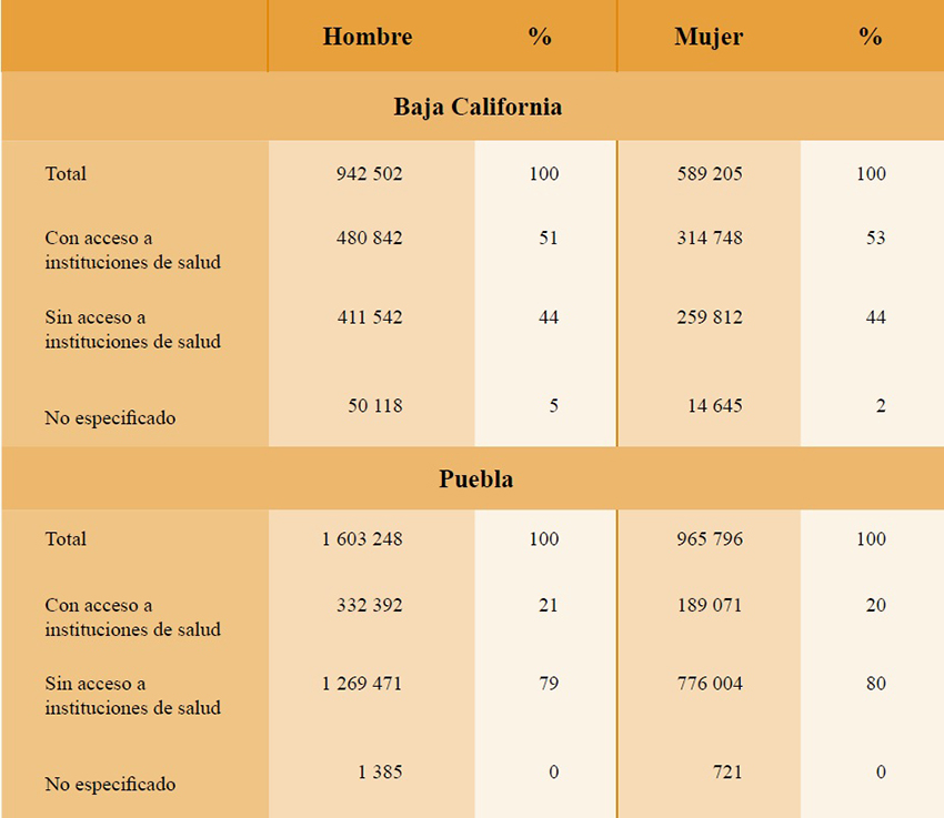 En la Tabla 11, podemos constatar algunos de los hallazgos en relación con la mayor formalización del empleo en Baja California, lo cual se traduce en un mayor acceso a las instituciones de salud, tanto para hombres como para mujeres, pues los niveles de acceso para ambos sexos oscilan en alrededor de 50%; situación muy diferente en Puebla, ya que en esta entidad, tanto hombres como mujeres, tienen escaso acceso a las instituciones de salud, y solamente alrededor de 20% de la población ocupada cuenta con esta protección social.