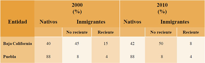 Una de las características que distinguen a estas dos regiones, como fronterizas y no fronterizas, se encuentra relacionada con los procesos de poblamiento. Esto se debe a que las regiones fronterizas del norte de México, se han poblado por la llegada de personas de otros estados del país, mientras que la población de Puebla, como región no fronteriza, tiene una composición mayoritaria de personas nacidas en la entidad (90%), tal como se puede ver en la Tabla 1; en contraste, en Baja California, los nacidos en la entidad representan solamente la mitad de la población.