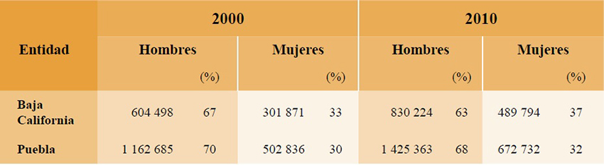 La incorporación de las mujeres al trabajo remunerado del 2001 al 2010 ha sido más intensiva en Baja California, lo cual se refleja en una mayor proporción de mujeres como parte de la población ocupada, ampliándose el porcentaje de diferencia entre las dos entidades en 5% para el 2010, cuando las mujeres representaron 37% de la población ocupada en Baja California y 32% en Puebla (Tabla 3).