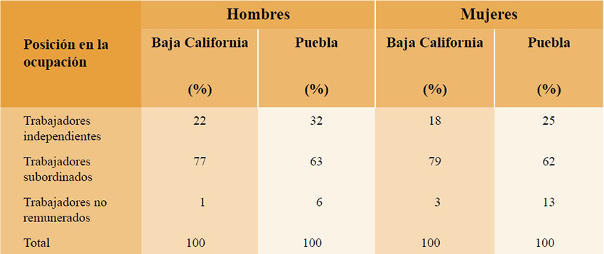 En relación con la estructura ocupacional, vimos que por el peso del trabajo independiente (que incluye principalmente al trabajo por cuenta propia) este persiste, reproduciendo la heterogeneidad estructural, aunque con mayor extensión del trabajo asalariado en Baja California. Mientras que en Puebla, el trabajo independiente es ocupado por una tercera parte de la población ocupada, para los hombres, y una cuarta parte de las mujeres, quienes siguen teniendo un porcentaje importante de ocupaciones como familiares sin pago. En Puebla, el mercado de trabajo se caracteriza por la mayor presencia de trabajo atípico, pero ligado a la persistencia de economías de subsistencia.