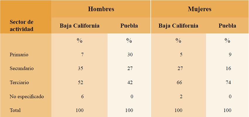 Entre los hombres, la diferencia más notoria es el porcentaje que se ocupa en el sector primario, que en Puebla es de 30% frente a 7% en Baja California. En el sector secundario tenemos que 27% de los hombres poblanos se ocupan en actividades de este sector, y 35% lo hace en Baja California. En el comercio y servicios (sector terciario) laboran 42% en Puebla y 52% en Baja California (Tabla 5).