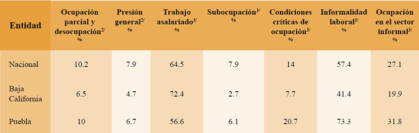 La tasa de ocupación en el sector informal se refiere a la población ocupada en una unidad económica que opera a partir de los recursos del hogar, pero sin constituirse como empresa, de tal suerte que la actividad no tiene una situación identificable e independiente de ese hogar. En Puebla asciende a 31.8% y en Baja California a 19.9%, la primera cifra se encuentra por arriba de lo que ocurre a nivel nacional (27.1%) mientras que la segunda se encuentra por debajo de este promedio.