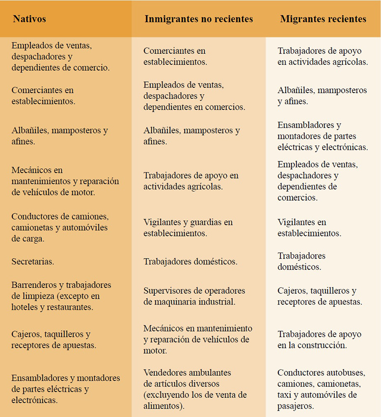 Con el objetivo de analizar la segregación de la población según su condición migratoria y el sexo, hemos identificado las 10 principales ocupaciones de la población económicamente activa en 2010. A partir de esta información se observa que, en términos de ocupaciones, en Baja California la población migrante no reciente y reciente presentan diferencias importantes respecto a la población nativa. Destacan las ocupaciones de vigilantes y guardias en establecimientos y trabajadores domésticos, como parte de las ocupaciones principales de la población inmigrante, así como la ocupación de trabajadores de apoyo a la construcción, en el caso de migrantes recientes. La ocupación de ensambladores y montadores de partes eléctricas y electrónicas se encuentra entre las 10 principales ocupaciones de nativos e inmigrantes, lo cual indica la importancia del empleo en este sector de actividad en el estado, lo mismo se puede interpretar de la ocupación de comerciante en establecimientos (Tabla 7).