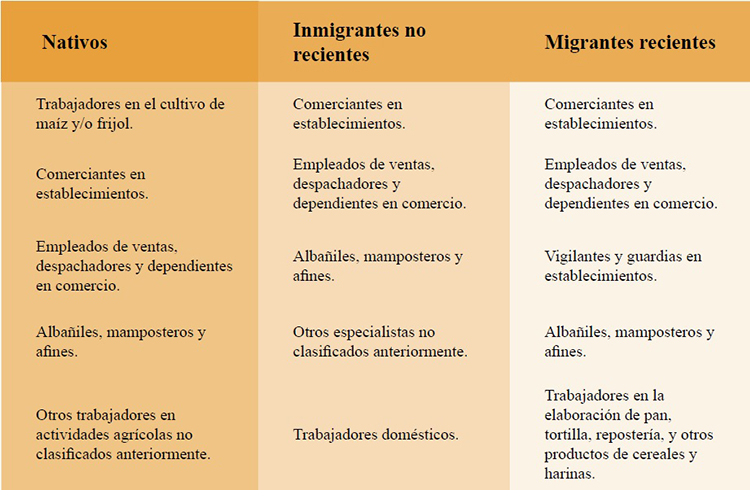 En contraste, en Puebla, no pareciera tan evidente la segregación ocupacional según condición migratoria, ya que hay varias ocupaciones que se clasifican como principales para las tres categorías de población, aunque la categoría ocupacional de vendedores ambulantes de artículos diversos (excluyendo los de venta de alimentos), pareciera presentar cierta concentración entre la población inmigrante. En el caso de inmigrantes recientes podrían ocuparse con cierta recurrencia como vigilantes y guardias en establecimientos o en la elaboración de pan, tortilla, repostería, y otros productos de cereales y harinas. Resalta para esta entidad que entre las 10 ocupaciones más importantes para la población nativa, tres están asociadas con el sector agrícola y la principal es la de trabajadores en el cultivo de maíz y/o frijol (Tabla 8). Aunque no hemos considerado la diferencia entre población indígena y no indígena, muy posiblemente se exprese en las ocupaciones una segregación por el origen étnico. Asimismo, hay varias ocupaciones principales e independientes de la condición migratoria, aquellas que pertenecen al sector terciario (en particular al comercio), y la de operadores de máquinas de costura, bordado y de corte para la confección de productos textiles y prendas de vestir. Estos empleos son ofrecidos por empresas maquiladoras para la exportación, sobre todo, en el Valle de Tehuacán.