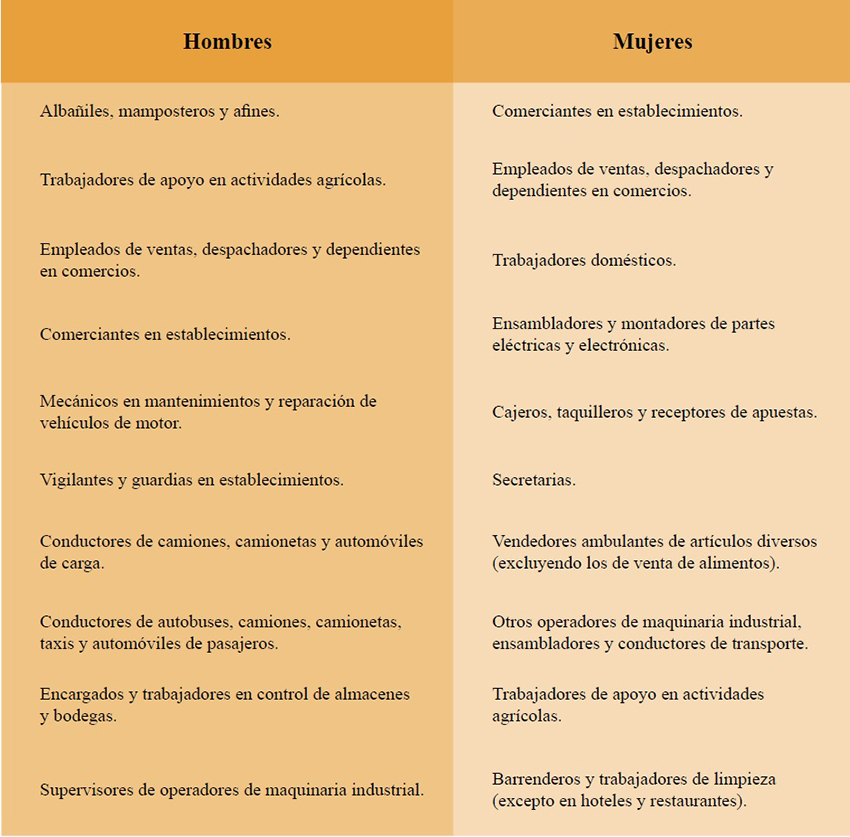 Si hacemos una lectura de la Tabla 9, que resume las 10 principales ocupaciones según el sexo, en Baja California, se puede señalar que las ocupaciones de ensamble de electrónicos, trabajo doméstico, cajeras, taquilleras y recepcionistas de apuestas, secretarias, vendedoras ambulantes, operadoras de máquinas industriales o barrenderas se encuentran feminizadas, mientras que los hombres tienden a concentrarse en ocupaciones tales como albañiles, mamposteros y afines, como vigilantes y guardias en establecimientos, como mecánicos en mantenimiento y reparación de vehículos de motor y como conductores y otras ocupaciones relacionadas con la industria.