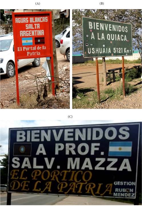 Frente a todo lo anterior, me pregunto si el estudio de las fronteras supone enfocarse exclusivamente en las periferias. Con frecuencia, la producción de sentidos y la definición de cursos de acción sobre la frontera se generan en los centros. Aun cuando estén emplazadas sobre los límites interestatales o en sus proximidades, Asunción, Buenos Aires, Montevideo no se piensan como lugares de frontera. Lo mismo ocurre con Santiago y La Paz, que están entre 60 km y 95 km del borde, respectivamente, en línea recta. La construcción del sentido de centralidad tiende a producirse como un opuesto al carácter periférico (y alejado) de los portales; pareciera que solamente ahí es donde ocurre la frontera. En este sentido, un caso interesante en la Argentina es el de dos ciudades que no han sido beneficiadas con la jerarquía simbólica de ser punto extremo: Aguas Blancas y Prof. Salvador Mazza. Son dos pequeñas ciudades emplazadas sobre el límite que el país comparte con Bolivia. En ambas se han colocado carteles que anuncian, a quienes llegaron hasta allí, que se trata del “portal” (Figura 1A) o del “pórtico” (Figura 1B) “de la patria”. Esos carteles no “miran” hacia Bolivia, sino hacia el interior de la Argentina, a quienes llegan desde el centro. En La Quiaca, sobre el mismo límite internacional, en cambio, un cartel instalado por la Dirección Nacional de Vialidad recuerda que hacia el otro extremo del país, en el sur, a 5.121 km, se encuentra Ushuaia (Figura 1C), “la ciudad más austral del mundo”.
