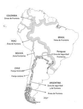 En su más reciente Constitución de 1988, Brasil establece la franja o faja de frontera, con “hasta ciento cincuenta kilómetros de ancho a lo largo de las fronteras terrestres” (Constitución de la República Federativa de Brasil, 1988, art. 20). En la normativa de los restantes países sudamericanos (leyes orgánicas o textos constitucionales) se han institucionalizado otras categorías: área de frontera, zona fronteriza, franja limítrofe, etc (Figura 2). Cualquiera de estas categorías lleva consigo significados, funciones y atribuciones valorativas específicas, que participan en la construcción simbólica de las fronteras de los diferentes territorios nacionales.