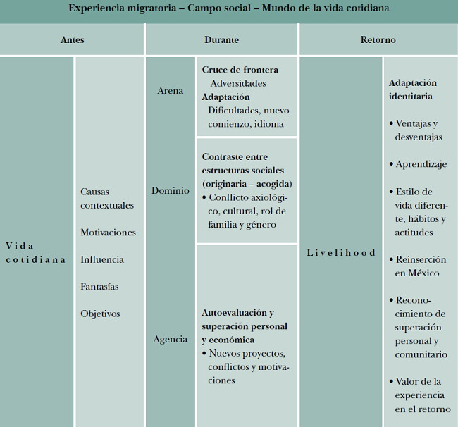 El tamaño de la muestra fue determinado por la observación y análisis en la diversidad de ideas obtenidas en la extracción de los datos, por lo que, una vez que estos se mostraron repetitivos se declaró punto de saturación (Strauss y Corbin, 2002). La extracción de la información fue delineada con base en la Teoría Fundamentada de Glaser y Strauss (1967), para lo cual: a) se realizaron 10 entrevistas semiestructuradas organizadas temáticamente de acuerdo con la eventualidad de la migración (antes, durante y retorno) y los objetivos planteados en la investigación; b) se realizó transcripción y edición, lectura y relectura del material adquirido en las entrevistas para buscar y entrever estructuras y significados; c) se generaron códigos de manera inductiva detectando patrones significativos en la información recabada: en el antes se consideran las causas contextuales, motivaciones, influencias, fantasías y objetivos; en el durante se tomaron en cuenta el cruce de frontera, la adaptación y el contraste de las estructuras sociales (de origen versus de acogida); y en el después se considera la readaptación identitaria tomando en cuenta las ventajas y desventajas, el aprendizaje, estilo de vida diferente, hábitos y actitudes, la reinserción laboral y social, reconocimiento de superación personal y comunitario y, valoración de la experiencia en el retorno. Dichos códigos se consideran subcategorías de análisis que, d) fueron contrastadas bajo codificación axial (Strauss y Corbin, 2002) en relación con las categorías previamente establecidas de la estructura teórica de Long (2007) con los conceptos de Arena, Agencia, Dominio y Livelihood. Estos a su vez, e) fueron organizados con base en la eventualidad de la migración, donde cada etapa toma el papel de contexto circunstancial en la interacción del migrante y el campo social; considerando así, f) el campo social (Long, 2007) como macrocategoría constituida de las etapas migratorias, como se muestra en la Tabla 1.
