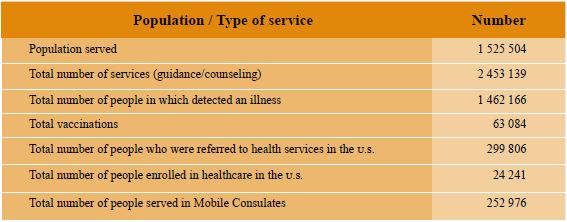 Finally, there is the case of the Consulate of Mexico in Miami. The total population in their area was 7 500 000 persons in 2015. There were approximately 260 000 Mexicans in their circumscription. For the reviewed time frame, the Health Window assisted 12 000 persons, of which 90% did not have any type of insurance. However, there is no available information regarding the referrals to community clinics and therefore it is not possible to make any deductions regarding the health condition of those who were served by the Health Window.