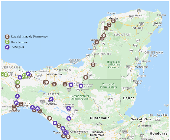 Un lugar destacado en esta categoría de agentes lo ocupan las casas de migrantes. Estas casas o albergues son los lugares de refugio y recuperación para las personas migrantes en su travesía por el territorio. Las constituye el principio asistencial, muy asociado a la iglesia católica y a su larga tradición de santuario (Washington, 2020; Shoemaker, 2013; Lippert & Rehaag, 2013; Doering-White, 2018), actualizado en la cultura de los derechos humanos y el humanitarismo (Fassin, 2007) que convoca a muchos de los voluntarios que allí prestan sus servicios. Son lugares de transitoriedad, puesto que en su mayoría ofrecen los servicios por estancias cortas, que oscilan entre los tres y cinco días. Se distribuyen a lo largo del territorio del país, acompasando la travesía, como si el paso organizara los lugares, o como si esos lugares que son los albergues imaginaran el paso a través de sus medios de movimiento y terminaran haciendo la migración que acogen. Albergues y ferrocarril se corresponden en esencia, bien porque tienden a ubicarse en las cercanías de las vías; bien porque el tren es su imaginario constitutivo a través de relatos o de su evocación en los murales que ilustran las paredes de casi todos los albergues. Como sea, tren y albergues hacen al dato primario de la travesía migrante y, en última instancia, al objeto de la gobernanza. La Figura 1, en el trazado de la línea ferroviaria del istmo de Tehuantepec, muestra la disposición de estos actores junto a las vías del ferrocarril, como si estas construyeran el itinerario y este tipo de dispositivos que gobierna la migración en tránsito.