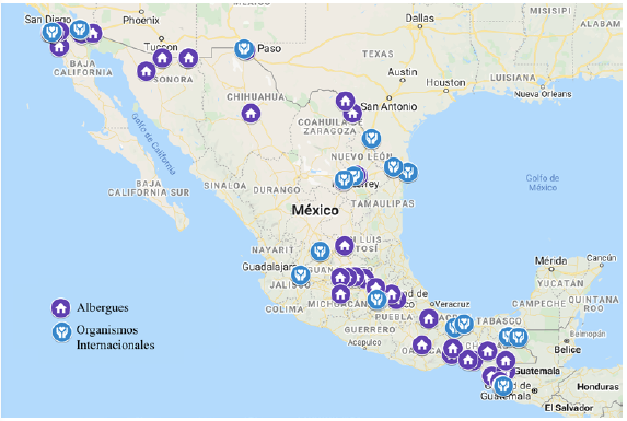 Organismos como ACNUR, UNICEF, OIM y MSF han visto un importante crecimiento en sus operaciones a partir de las caravanas de 2018 y aquellas que siguieron, abrieron oficinas en la frontera norte y sur, y se aliaron con diferentes casas de migrantes para incrementar su alcance. A través de mandatos y de la capacitación y profesionalización de socios (los albergues y las organizaciones de la sociedad civil [OSC]), los organismos internacionales han ido aumentando su poder en la coordinación de esta estructura de la gobernanza. Ejemplo de ello es Programa Casa Refugiados, una OSC socia del ACNUR que desde 2015 se dedica a la asistencia humanitaria de los solicitantes de asilo y refugiados en Ciudad de México. Estos socios representan, para los organismos internacionales, un apoyo para la atención de una población que va en aumento, además de la posibilidad de habilitar espacios de atención en lugares donde no cuentan con una presencia operativa. Tanto el ACNUR como OIM, UNICEF y MSF tienen presencia en la red de albergues, ya sea a través de una oficina en la misma casa de migrantes, o por medio de actividades y visitas (MSF, 2020). La Figura 3 muestra la convergencia entre la infraestructura social que proporcionan los albergues o la logística de determinadas OSC en la disposición de sus oficinas junto a las casas de migrantes.