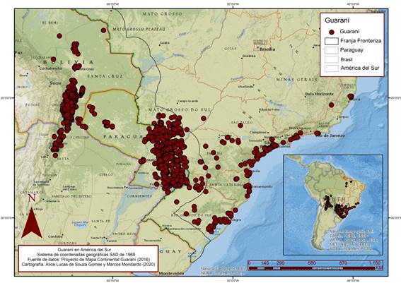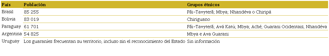 La Nación Guaraní se encuentra en Bolivia (Chirigano, Guaraní Occidental), Brasil (Ñhandeva, Avá Guaraní, Chiripá, Kaiowá, Mbyá, Aché, Avá Katú), Argentina (Mbya, Aché, Avá Katú), Paraguay (Chirigano, Guaraní Occidental) y Uruguay (Mbya, Aché, Avá Katú). Según el Equipe Mapa Guarani Continental (2016) se estima que la Nación Guaraní está formada por 280 000 personas, que habitan en 1 416 comunidades, aldeas, barrios urbanos en núcleos familiares, desde la costa atlántica hasta los Andes (Figura 1). La mayor población se concentra en Brasil con 85 255 personas; seguida de Bolivia con 83 019; Paraguay con 61 701; y, Argentina con 54 825 (Tabla 1).