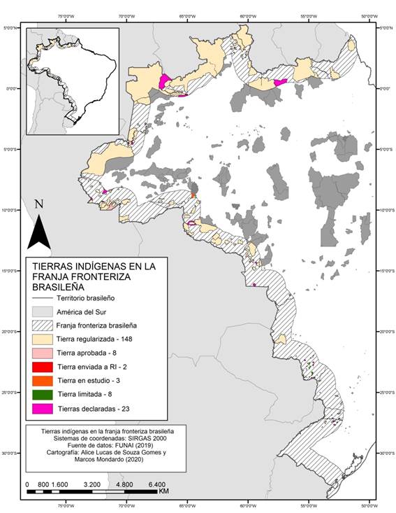 En Brasil, a lo largo de los 17 000 kilómetros de fronteras, hay una gran variedad de situaciones que involucran a los indígenas transfronterizos. No se trata simplemente de los indígenas que residen cerca o en la frontera, sino de los pueblos que transitan y cruzan constantemente esos límites político-administrativos. Además, la lucha por la tierra y el territorio forma parte de la conformación y el dilema de las fronteras nacionales, modernas y coloniales. Según el sitio Terras Indígenas no Brasil (2019) hay 192 tierras en la franja fronteriza brasileña, en las más variadas fases de regularización de tierras (Figura 2).