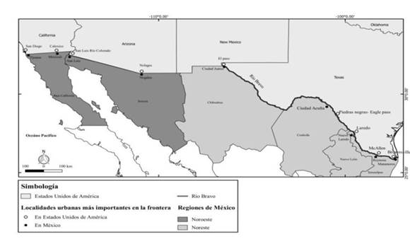 A partir de los límites internacionales fijados en 1846 entre ambos países, resultado de la guerra de intervención de Estados Unidos de América (EUA) contra México, la frontera que comparten ambos países tiene una extensión que abarca desde el océano Pacífico en Playas de Tijuana, al golfo de México en el estado de Tamaulipas. El Río Bravo o Río Grande ha servido como una barrera natural divisoria en la región noreste de México, que hace visible su cauce desde Ciudad Juárez, Chihuahua, hasta el golfo de México. Por otro lado, la región noroeste de esta frontera fue fijada con la instalación de obeliscos o mojoneras, además de basarse en divisiones geográficas establecidas por cerros, desiertos, esteros y cañones (Piñera, 1985).