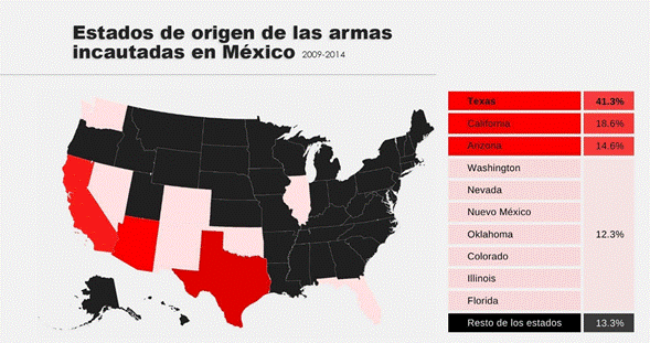 Independientemente de su origen, la mayoría de estas armas pasan a territorio mexicano a través de Tamaulipas, de acuerdo con el número de armas confiscadas en dicho estado, y, aunque se ha establecido que la mayoría de las armas tienen un origen legal, también existe contrabando de otro tipo de armas que ingresan a través de la frontera guatemalteca (Latin American Herald Tribune, 2011), que suelen ser adquiridas por los grupos delictivos luego de los choques violentos entre ellos y las fuerzas armadas y la policía. En el peor de los casos, estas armas son producto de asaltos directos a los arsenales y a las estaciones militares y policiacas por grupos delictivos (Borderland Beat, 2010).