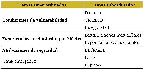 El marco interpretativo fue la fenomenología, se realizó codificación inductiva y análisis temático de las narrativas. En un primer momento se transcribieron las entrevistas para, posteriormente, a través de una serie de relecturas, realizar la codificación abierta y enfocada mediante la utilización del programa MAXQDA 2020, que permitió identificar los temas emergentes, sus conexiones y patrones. Esta información se sistematizó en una tabla de temas a partir de la identificación de las condiciones de vulnerabilidad, las experiencias en el tránsito por México y el tema emergente que trascendió al objetivo de la investigación y se le asignó el nombre de atribuciones de seguridad (véase Tabla 1) y finalmente se llevó a cabo la redacción de los resultados.