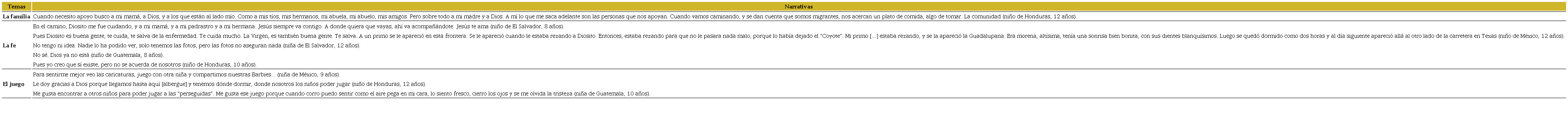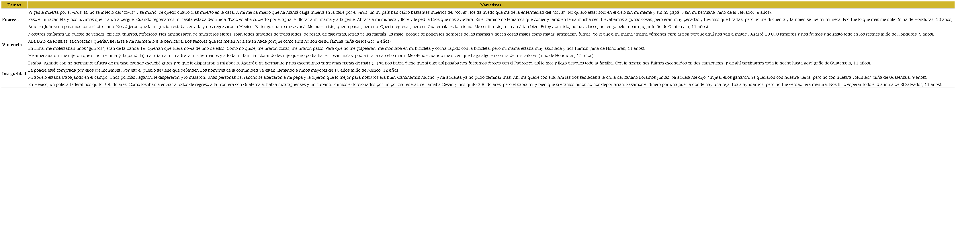 Por último, otro de los temas que emergieron dentro de las condiciones de vulnerabilidad es lo concerniente a la inseguridad, según los testimonios que las niñas y los niños compartieron de sus experiencias con las figuras de autoridad, como son agentes de migración y de la policía federal, se remiten a reflexionar cuál es el rol que dichas figuras desempeñan frente al fenómeno de la migración. Lo anterior se rescata en la Tabla 2, tras sus narrativas en las que compartieron las vivencias de violencia, corrupción, asesinato, pérdida de su hogar y protección a delincuentes.