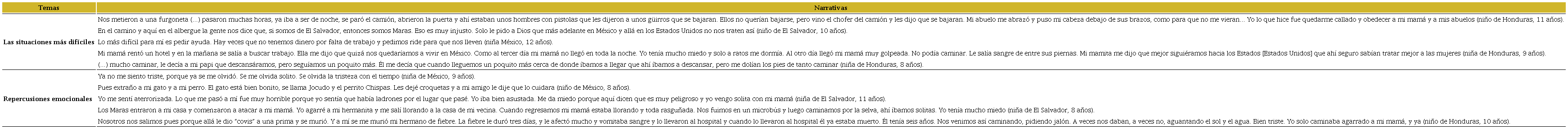 La partida de sus hogares y al caer en cuenta de la pérdida de sus seres significativos, así como el exponerse a riesgos durante el tránsito por México, el ser alejados de los familiares con los que viajan, el vivir agresiones por gente con la que coinciden en la ruta migratoria y la violencia de la que han sido víctimas de manera directa o indirecta ha conllevado a repercusiones emocionales (véase Tabla 3). Al respecto, la mayoría de las niñas y los niños se refieren a las experiencias vividas en la emigración como dolorosas, preocupantes, angustiantes, impactantes, aterrorizantes y que los han llevado a experimentar tristeza, desamparo, inseguridad, enojo y miedo.