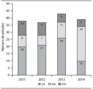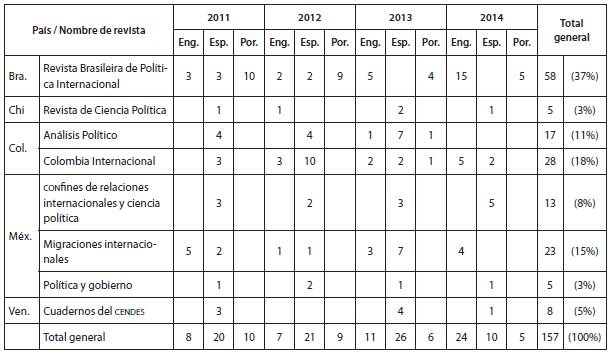 En segundo lugar, como se mencionó, el español presenta un predominio evidente. Sin embargo, es interesante tener en cuenta el visible crecimiento de las publicaciones en inglés registrado entre el 2011 y 2014. Se registra un aumento muy significativo en el número de artículos publicados en ese idioma, aunque es importante reconocer que la mayor parte de estos se concentra en la Revista brasileira de política internacional y en Colombia internacional de 2014 (ver anexo tabla 1).