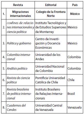El presente apartado se propone identificar algunas de las principales tendencias que caracterizan a la investigación en el área de las relaciones internacionales en la región. Para lograrlo llevamos a cabo un análisis estadístico de carácter descriptivo basado en una serie de indicadores bibliométricos4. Para su realización privilegiamos aquellas revistas incluidas en el SCI mago Journal Rank (SJR) (dentro de la categoría "Ciencia Política y Relaciones Internacionales" del área de Ciencias Sociales en Latinoamérica)5. Del total de once revistas que arrojó este filtro se identificaron tres mexicanas, dos colombianas, una de Chile, una de Brasil y otra más de Venezuela, para un total de ocho revistas académicas que, bajo las condiciones mencionadas, publican estudios sobre política internacional en la región (tabla 1).