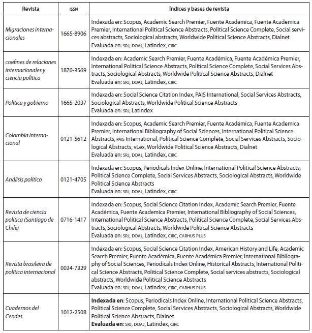 A simple vista, el panorama de las revistas seleccionadas es alentador en términos de la presencia en importantes portales de consulta por contenidos académicos. En este sentido, aumentan las probabilidades de que los estudios latinoamericanos en relaciones internacionales estén interactuando tanto con diferentes aproximaciones teóricas y metodológicas como con múltiples autores y temáticas. Esto genera un amplio abanico de posibilidades que permite a los investigadores acceder a un banco de contenidos que goza de un amplio reconocimiento internacional.