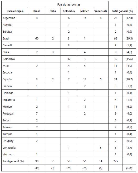En primer lugar, se observa una inclinación a publicar en revistas del país de origen. Principalmente sobre temas de interés local-nacional y en idioma español. En este sentido, tiende a hacerse evidente una producción académica focalizada en problemáticas definidas, más claramente visible en las revistas mexicanas y en la brasileña, cuyos intereses temáticos parecen ser mucho más delimitados que los de las publicaciones revisadas en Chile, Colombia y Venezuela.